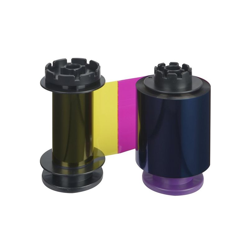 Evolis YMCKI ribbons consist of Yellow (Y), Magenta (M), Cyan (C) and Black (K) panels for printing a combination of full color images (Y,M,C) and one-color text or barcodes (K) which is a black resin panel. The inhibitor (I) panel is a special coated panel to prevent the design from being printed on specific parts of cards such as magnetic stripes, chips and signature panels. This is capable of printing 400 single-sided or 200 double-sided cards per roll.
